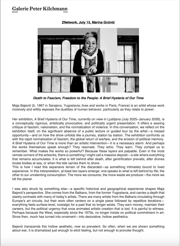 'Bajević is well-known in the art world since the '90s for the series of performances Women at Work (2001), as well as for her interest in collective identity, the unpacking tragedies through the personal experiences of their witnesses.