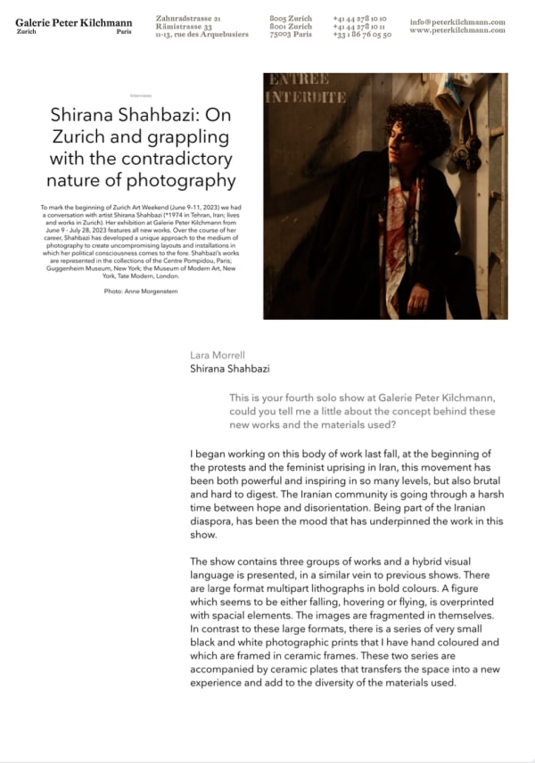 Shirana Shahbazi’s works are found in the collections of major institutions worldwide, including the Aargauer Kunsthaus, Aarau; Centre Georges Pompidou, Paris; Fotomuseum Winterthur; Guggenheim Museum, New York; Migros Museum für Gegenwartskunst, Zürich; Museum of Modern Art (MoMA), New York; Tate Modern, London; National Museum of Photography, Copenhagen; and Sprengel Museum, Hannover, among others.