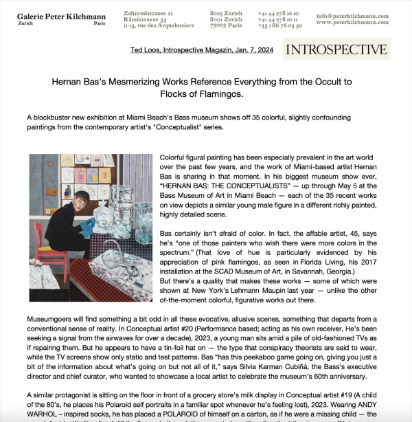 Hernan Bas studied at the New World School of the Arts in Miami. Hernan Bas has been presented in numerous exhibitions around the world. A monographic publication was published on the occassion of his solo show at the CAC, Centre de Arte Contemporaneo in Malaga (2018). The SCAD Museum, Savannah, Georgia held an impressive exhibition "Hernan Bas. Florida Living" curated by Storm Janse van Rensburg in 2017. A further important solo exhibition "The other side" was curated by René Zechlin (2012) at the Kunstverein Hannover. In 2016 Hernan Bas participated in the group exhibition "A sum of it's Parts" at the Polk Museum of Art in Lakeland, Florida. In 2015 he was part of the exhibition "Tracing Shadows" at the Samsung Museum, Seoul, South Korea. In 2014 a comprehensive anthology on Hernan Bas, with texts by Christian Rattermeyer and Jonathan Griffin, and an interview between Hernan Bas and Nancy Spector from the Guggenheim Museum, New York, was published by Rizzoli International Publications, New York. For the occasion of the exhibition "Hernan Bas - Bloomsbury revisited" (2017), Galerie Peter Kilchmann published a catalogue with illustrations and a cover designed by Hernan Bas.
