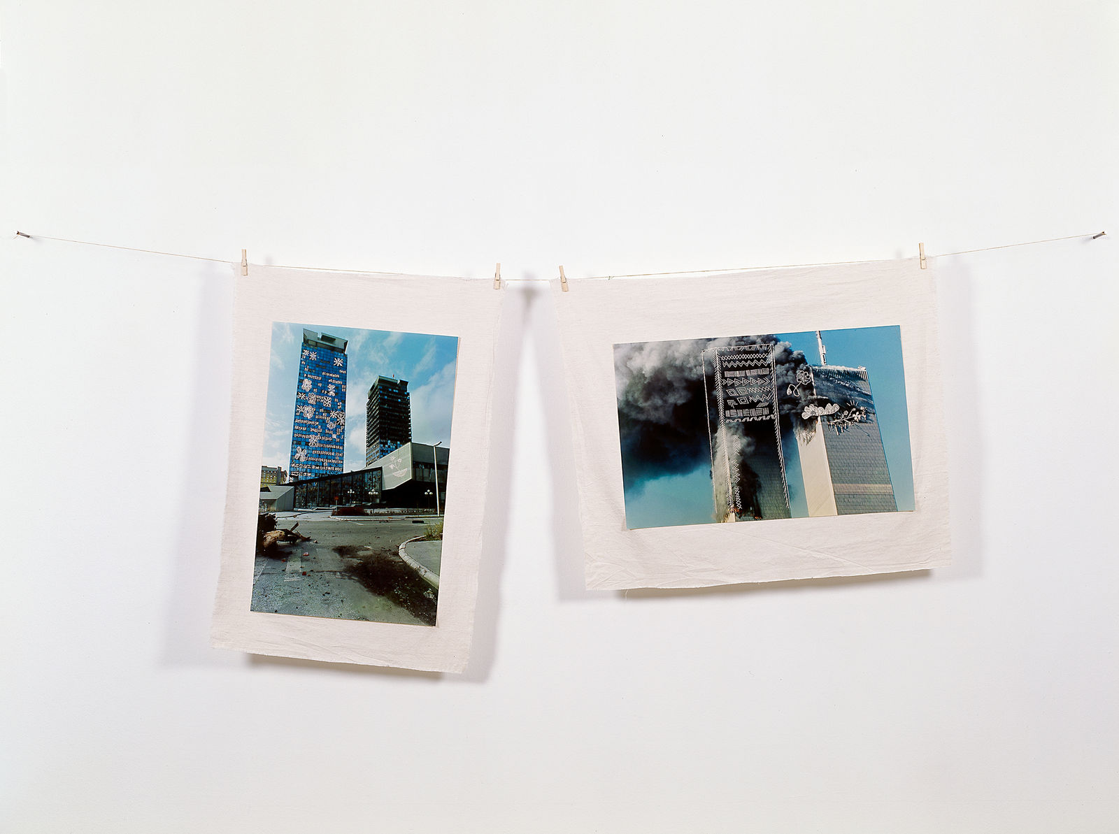 The video work Etui (May, 2005) shows the collaboration of the artist with the workers of Visoko, a city 20km in the Northwest of Sarajevo. Because of the war in Bosnia Herzegovina the traditional industry culture of making leather was stopped. After the war mostly parts of the fabrics were closed and replaced by new foreign fabrics, it seemed that the whole land were sold out. Maja Bajević entrusted unemployed factory-workers with the sewing of a “dress” for a typic- ally Bosnian uninhabited house in the Old Town of Sarajevo. With this symbolic act of dressing a house with a strong and robust material the artist demonstrates the loss of feeling at home and the loss of tradition.