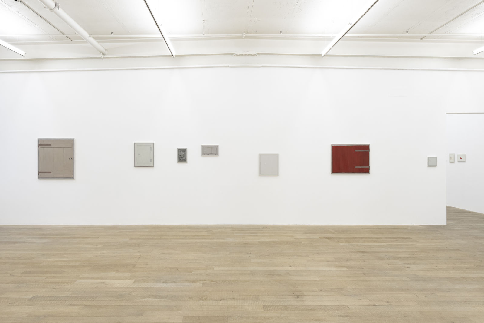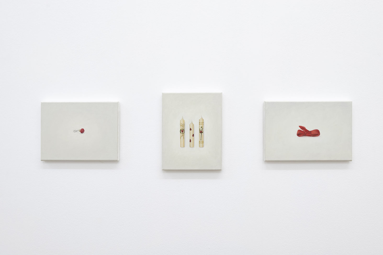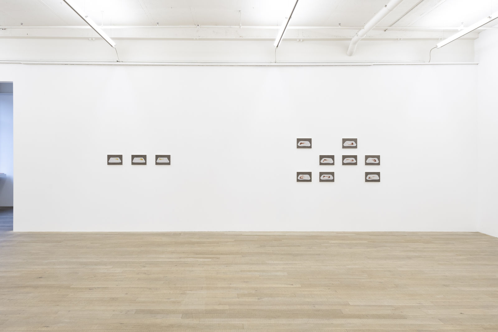 The first room reveals a universe of painted relicts from our civilization which recount the attempt to construct (human) existence. For example, three identically off-white paper plates, which nevertheless harbour differently smeared blobs of mustard sauce, gaze confidently back at us: Bratwurst (Grilled Sausage, 20 x 30 cm each). This three-part, minimalist series captures the strange beauty of a moment to which we usually pay little attention. The sausage and the human being become present in their absence. Bratwurst is joined by the Currywurst series (Curry Sausage, 20 x 30 cm, each), an eight-part work that shows remnants of ketchup-curry sauce on the same uniform cardboard trays. Seemingly insignificant everyday objects gain significance by giving them a platform and putting them in the spotlight through Hänsli's work. Beer glasses, for example, became the protagonists in Weekend Project I (2003) and salt sticks in Weekend Project II (2004).
