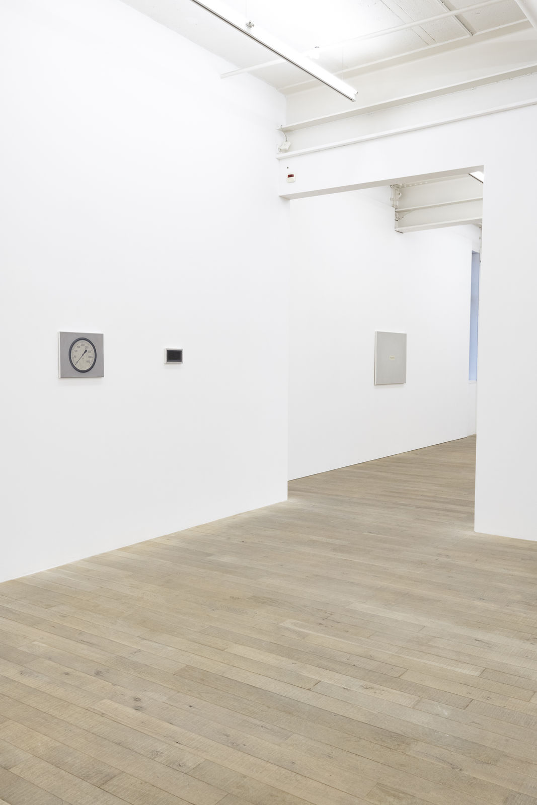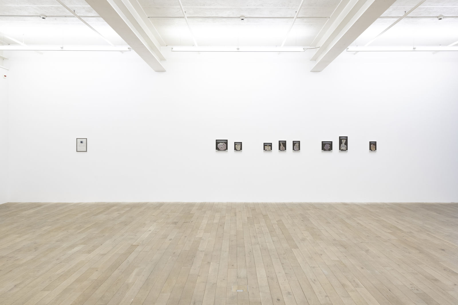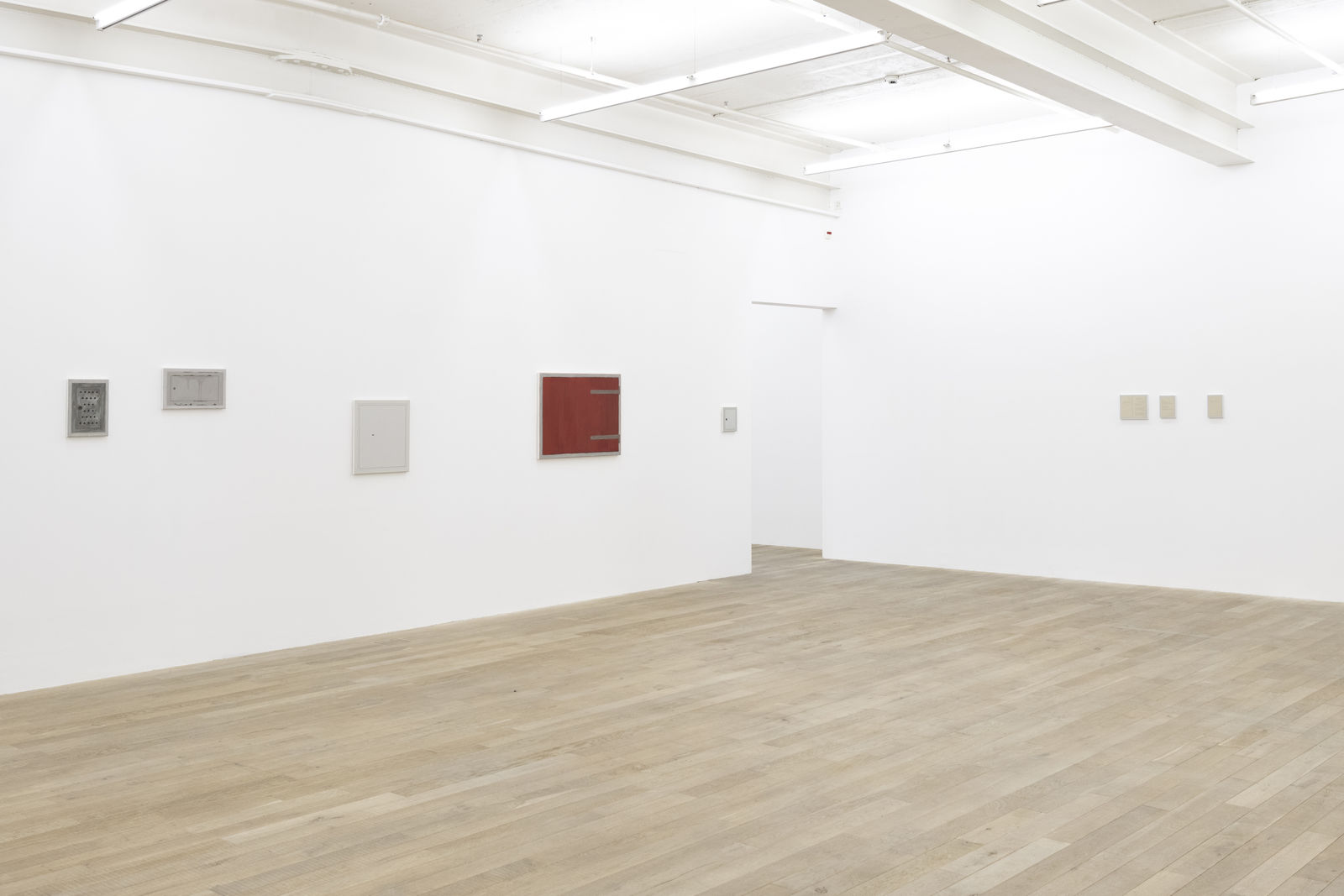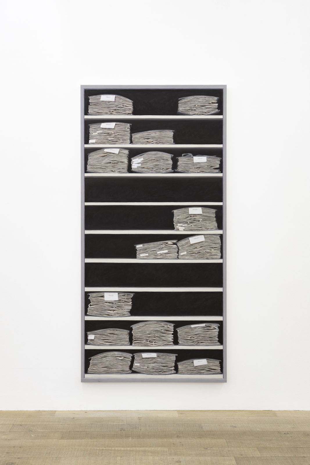 The first room reveals a universe of painted relicts from our civilization which recount the attempt to construct (human) existence. For example, three identically off-white paper plates, which nevertheless harbour differently smeared blobs of mustard sauce, gaze confidently back at us: Bratwurst (Grilled Sausage, 20 x 30 cm each). This three-part, minimalist series captures the strange beauty of a moment to which we usually pay little attention. The sausage and the human being become present in their absence. Bratwurst is joined by the Currywurst series (Curry Sausage, 20 x 30 cm, each), an eight-part work that shows remnants of ketchup-curry sauce on the same uniform cardboard trays. Seemingly insignificant everyday objects gain significance by giving them a platform and putting them in the spotlight through Hänsli's work. Beer glasses, for example, became the protagonists in Weekend Project I (2003) and salt sticks in Weekend Project II (2004).