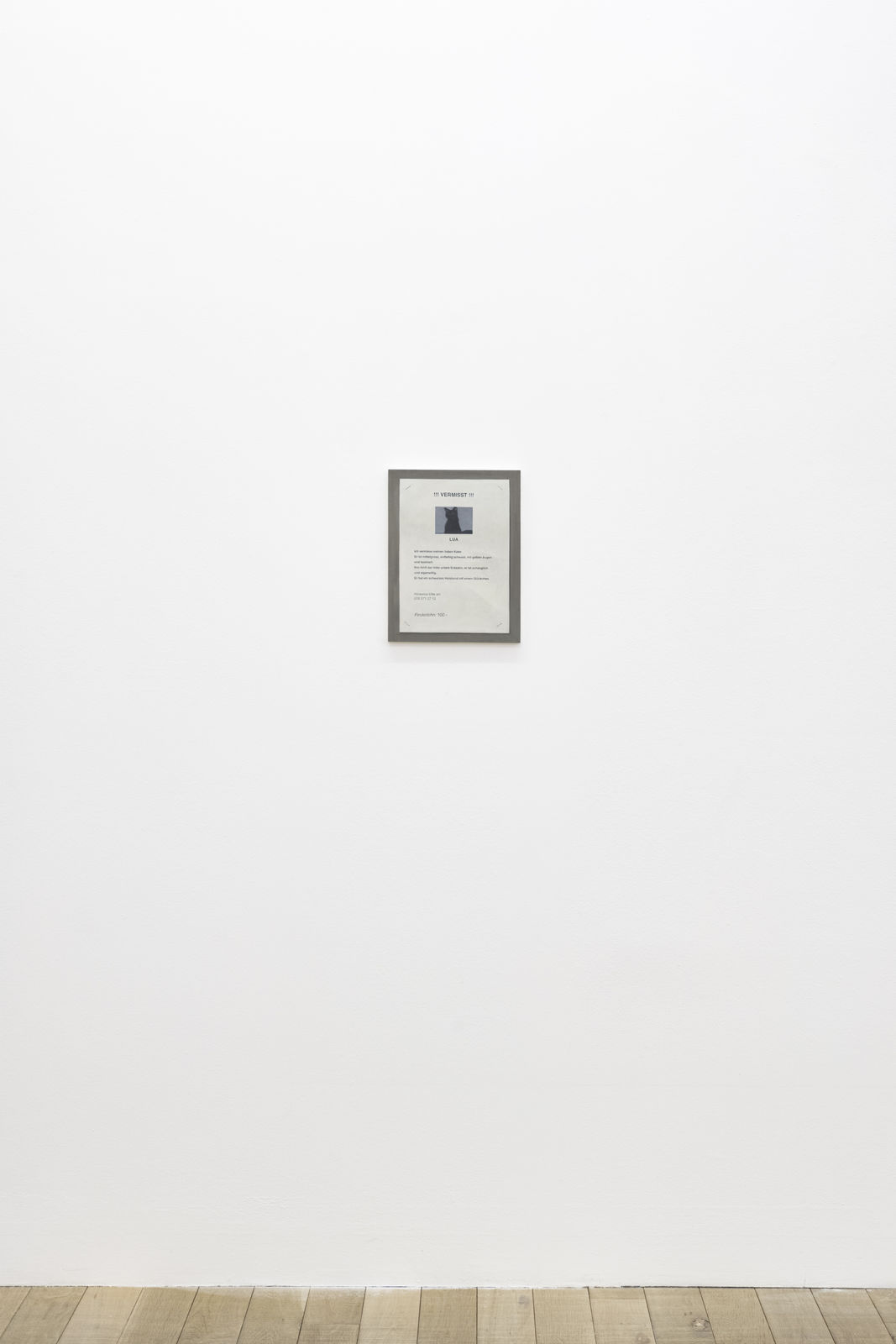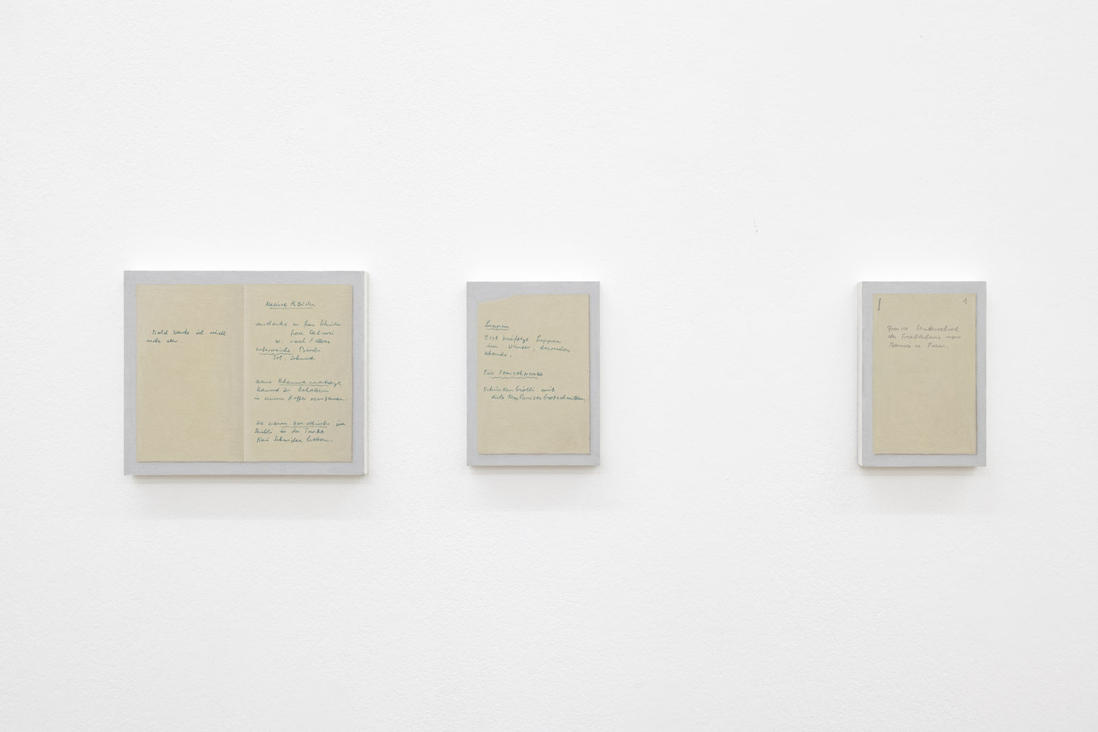 Frontally portrayed, closed facades convey emotions of hope, desire, promise and especially the urge for answers: What is hiding behind closed doors? To this question, Hänsli deliberately gives us no answer through his paintings of closed coverages in the second room. For example, we encounter the works Tresor (Safe, 49.5 x 43.5 cm), Rote Klappe (Red flap, 65.5 x 85.5) or Milchkasten (Parcel box, 54 x 43.5 cm), all paintings of closed doors, of exteriors. The artist does not want to show us what lies behind them, but rather wants us to explore the surface of these objects, these screens. Further the painted offertories focus additionally on the supposed salvific effect of words. The curiosity of what lies concealed is potentiated by Hänsli's method. For the artist, a thing is never just a thing. Hänsli paints objects in order to be able to see them properly, in particular to make them tangible for himself. Paintings and especially representations of vessels always function as containers for content, narratives or traditions that are inscribed into the surfaces by both the artist and the viewer. Also, in this section are works that center text fragments, such as Fernsehparty (TV Party, 18 x 13 cm) or Grosser Unterschied (Big Difference, 18 x 12 cm): once important letters that have lost their relevance over time and have become indifferent. Vermisst (Missing, 34.5 x 26.5), an oeuvre from the first room, can also be seen in this context. Is the cat Lua for instance still missing or has it been long forgotten? Language and texts also act as storage tools and are at the same time whirring, transient constructs, gaining a new dimension of eternity in the artist's painting.