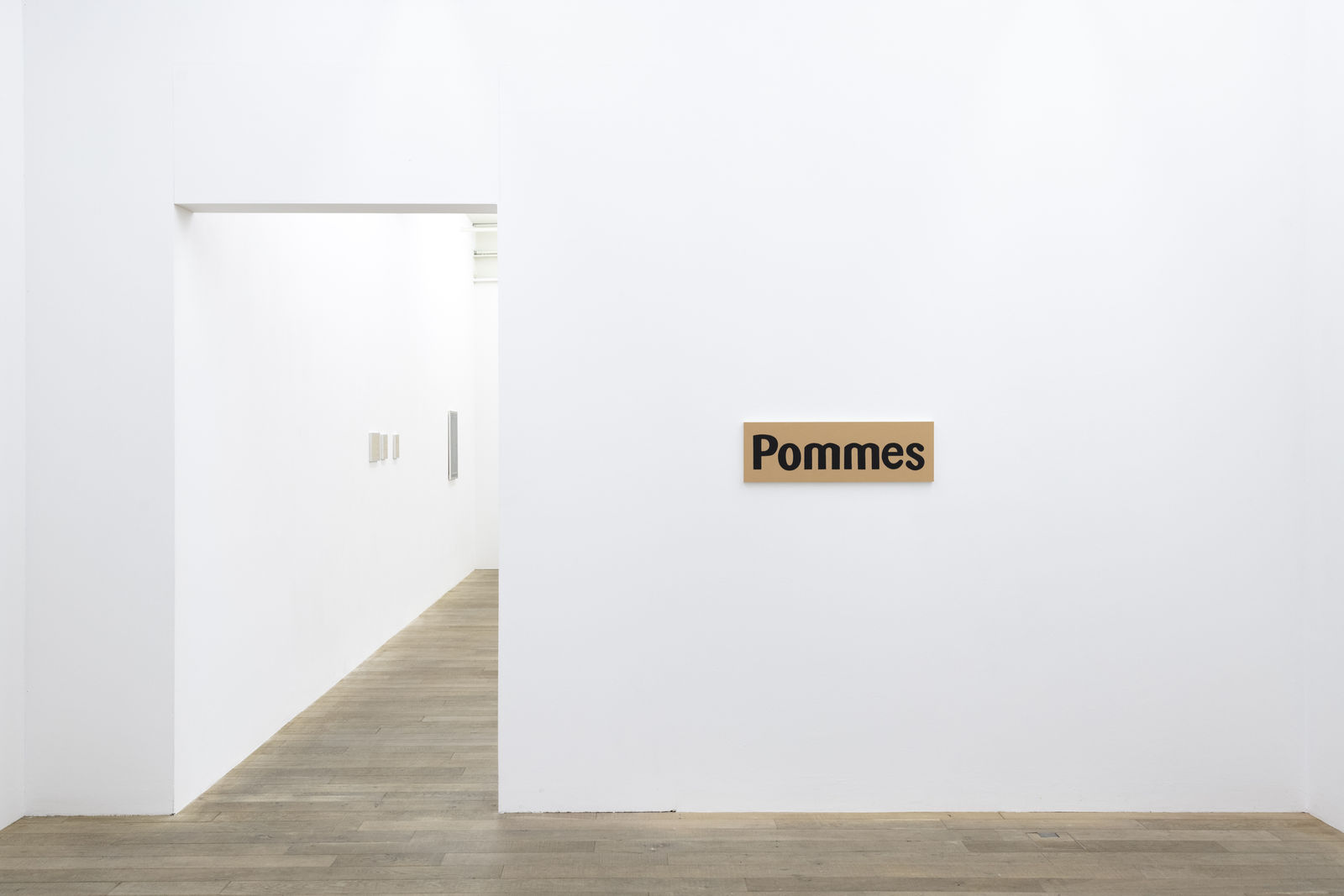 Eventually, the beginning and the end, the fragility of human existence and its disappearance are scrutinized more intensively: pleasure and comfort are closer together than one might think. Pommes (24 x 76 cm) is a work that evokes this very word in black letters on a potato-brown background. It is a sequence of letters that reminds the viewer of the promising flavour of this delicacy - the potato dish, however, is present by its absence. Marlies (24 x 40 cm) is the first "full-body portrait" of a person in Hänsli's oeuvre: a mountain of tipped-out ashes. Hänsli's serious humor is hidden, approaching the work carefully and respectfully. It encourages us to discard old patterns of perception and to approach things that we would otherwise not have considered ''image-worthy'' with unexpected curiosity. The work Krippe (Crib, 52 x 80 cm), which shows the fresh imprint of a living creature, is also part of this iconography. Triptychon (20 x 26 cm; 26 x 20 cm; 20 x 29 cm) depicts objects that can automatically evoke memories when viewed. For example, as small and ordinary as a toadstool decoration can be, we have probably looked past it instead of really looking at it.