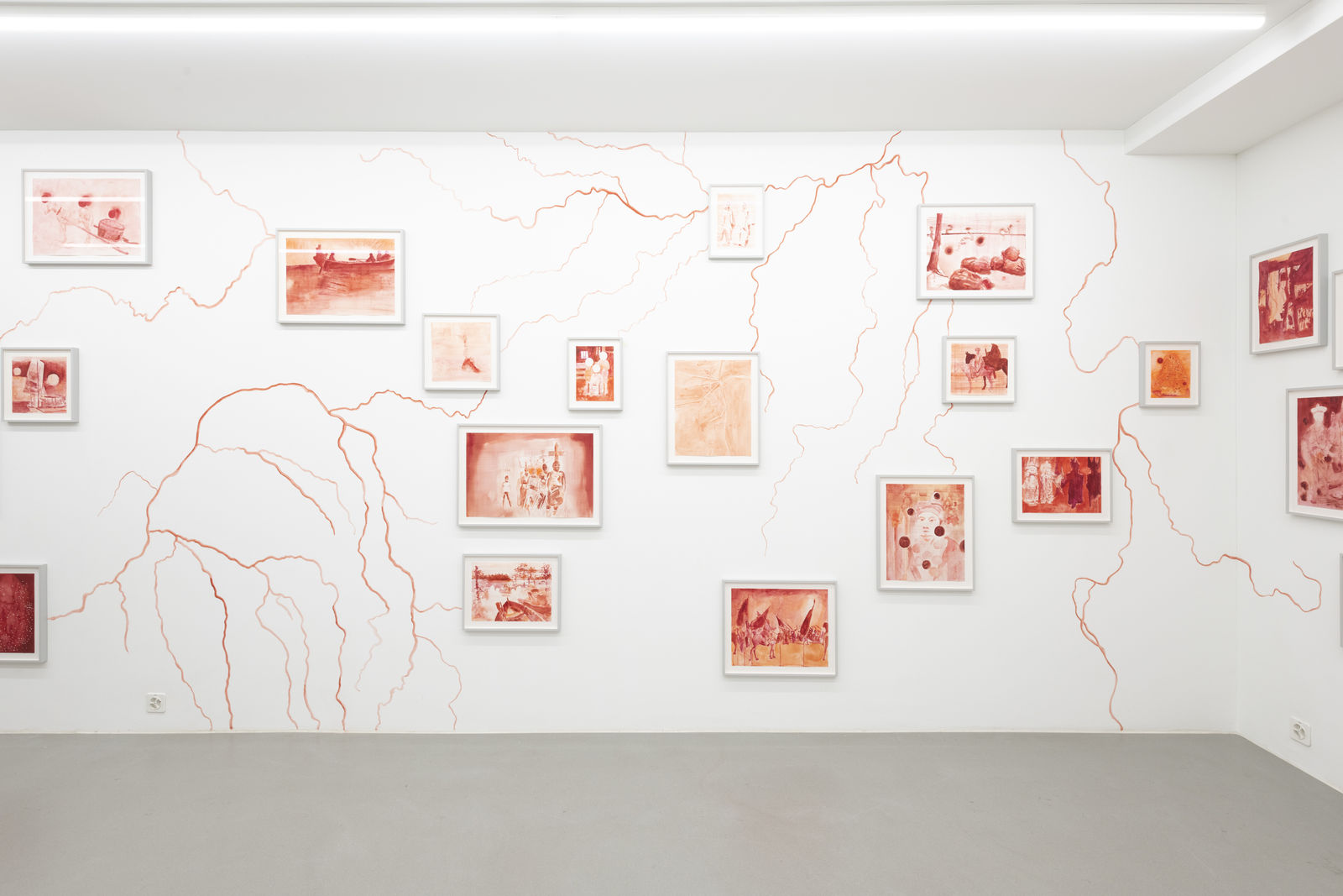 Wittwer placed over twenty monochrome watercolors in various small formats with the uniform title Die Mission / The Mission in a salon-like hanging between the painted rivers. They continue the motif of the ever-present red color. The scenes in the monochrome works look like blurry negatives and positives that were taken directly from the rich fund of the two photo archives. However, the reduction of color and the collage-like compositions create a distance from the source material through their abstraction. Painted foxing and scratches carried over from the negatives, refer to the ambiguity between painting and reality. Wittwer for instance stylizes them into stars in various night scenes, and scratches become abstractly painted tree trunks. Boats and ships recur as motifs. A group of African envoys appears to float in mid-air through the composition but meets a delimiting painted beam as a barrier in the upper half of the picture. Children in folkloric costumes play with dolls and shadowy shapes. The captured scenes with children also served to reveal the human aspects of the colonial and ethnological activities of Pitt Rivers and the Basel missionaries. Sources report that Pitt Rivers always recognized himself in the children caught on camera. Through the wet gradients and the continuation of the doubling, the subjects of the various painted subjects appear as images that make the period of colonialism seem like a strange dream.