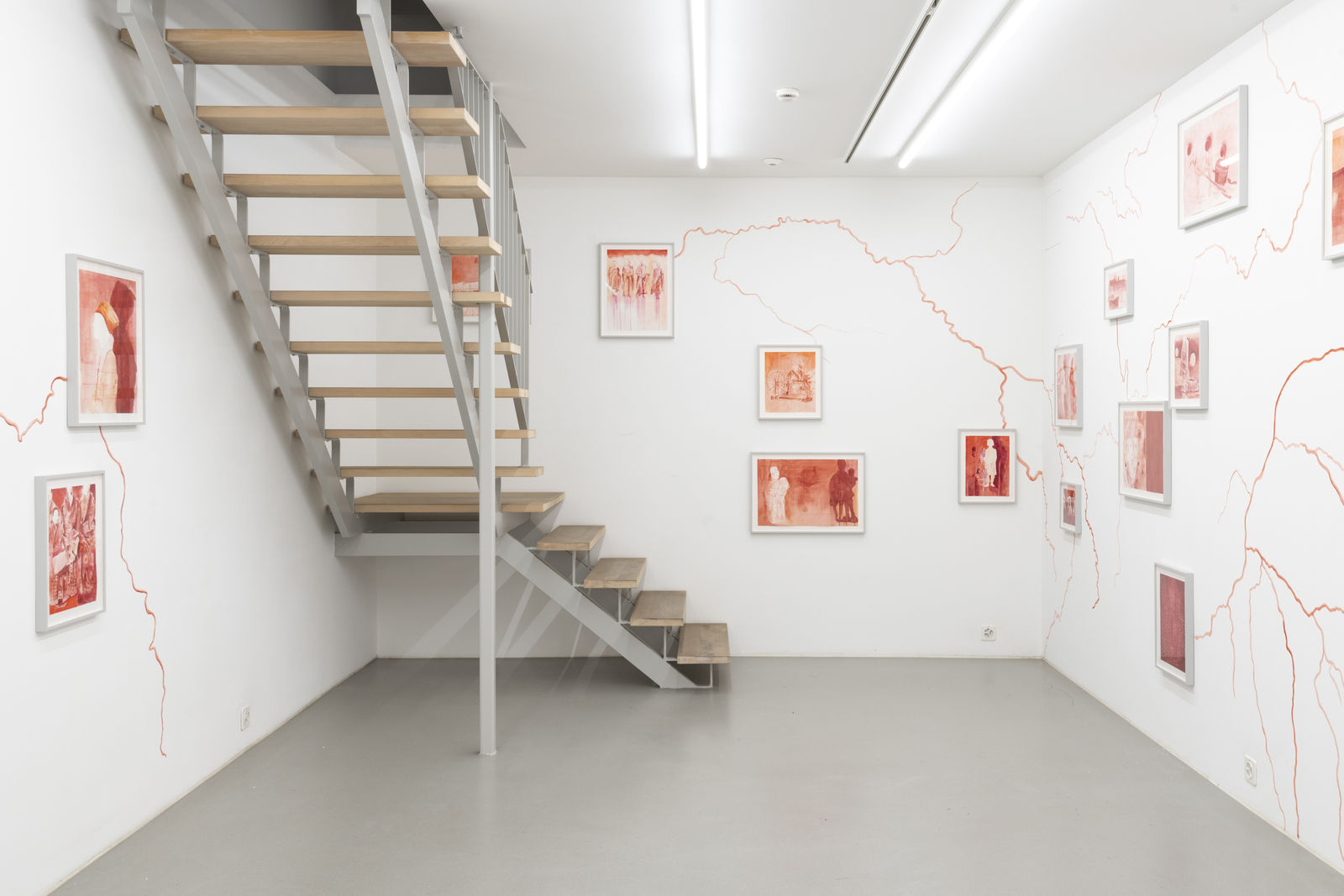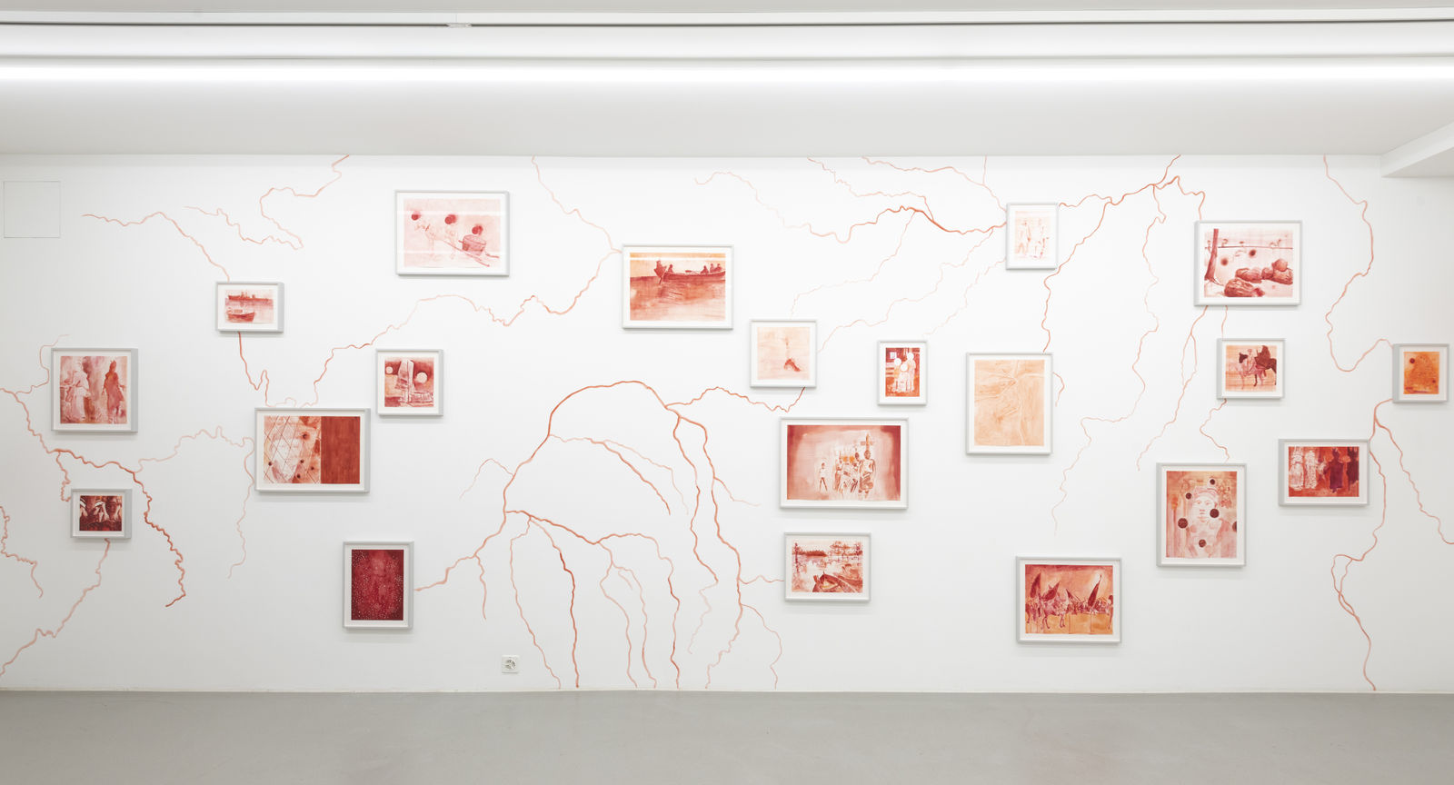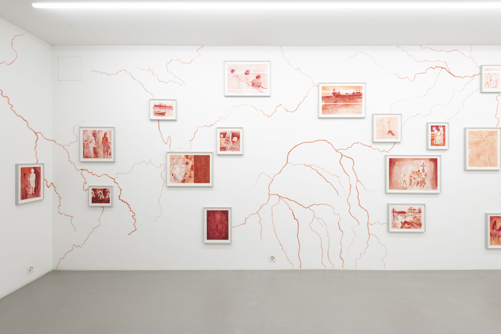 In the basement of the gallery, Wittwer installed a mural that runs through the entire room. With various elongated lines in red color, he replicates the courses of the various rivers that the colonial traders and missionaries navigated at the time of their expansion. The rivers formed the nexus in which the Western colonizers carried out their activities and in which they encountered the subjects of their photographs. The murals depict, for example, the Amur River in Manchuria, the Yangtze, the Mekong, the Amazon, the Senegal, the Congo, and other important rivers that led to the subjugation of the respective natives by the colonialists. The red color points to Wittwer's interpretation of the rivers as the blood vessels of this development. The transportation of cultural treasures took place primarily in a geographical direction and nourished the colonialist empires in an economic and cultural-historical way.