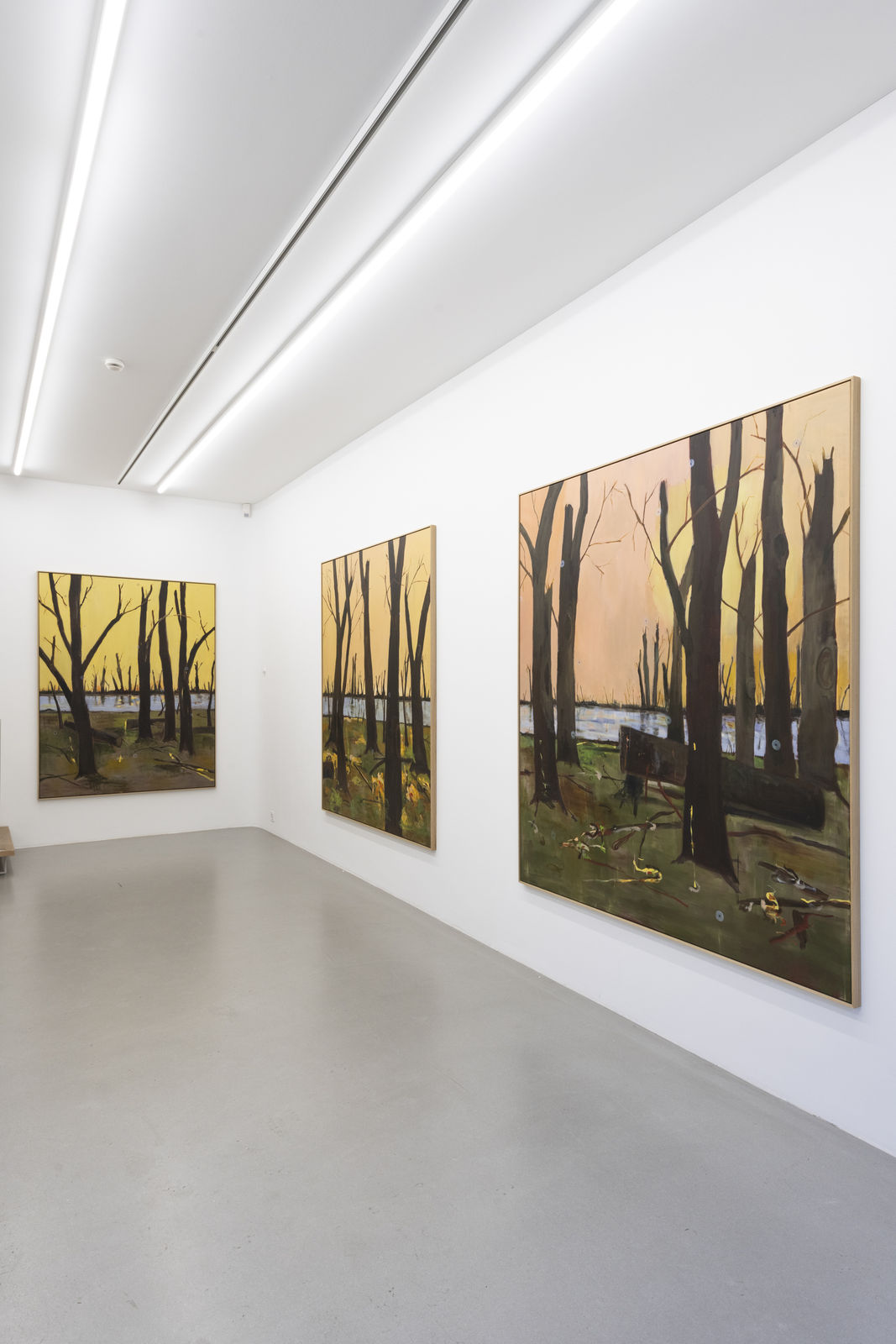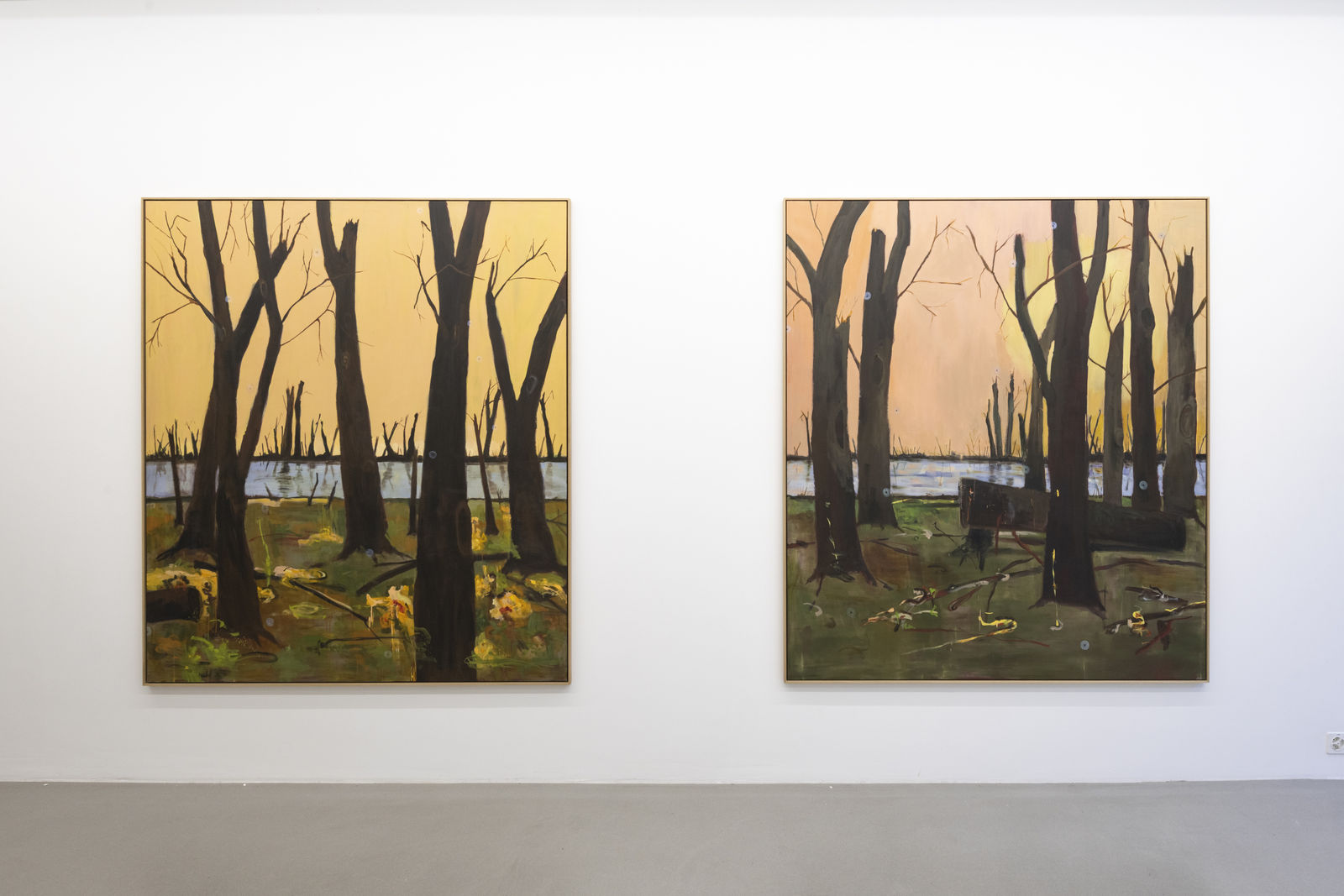 Three large paintings on the ground floor of the gallery set the basis for the formal and conceptual content. The river landscape that the artist stages in the three works appears to have been affected by natural or man-made events. Barren, presumably devastated forest landscapes have always been part of the artist's repertoire. In the foreground of the compositions are painterly elements, high-contrast brushstrokes that exist in the mannerism of wild painting as a statement about the painterly act itself in the work. Wittwer placed painted foxing spots across the composition of the canvas. These brush-applied circles shape a moment of further abstraction and create an additional layer to the paintings. They form points of contrast that manifest the relationship between reproduction and reality, source material, and pictorial implementation.