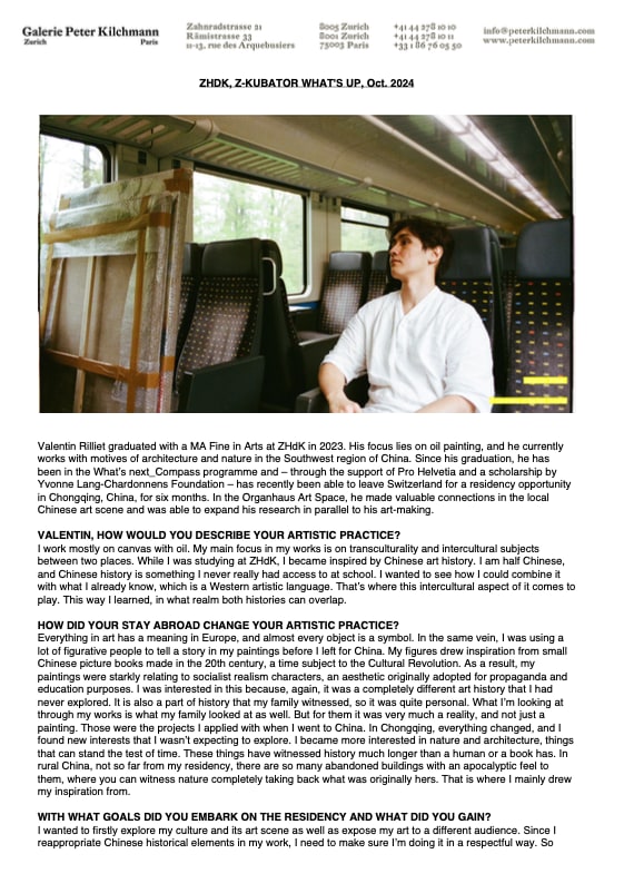 In his new oil paintings, Rilliet continues to explore the complex exchanges between his Chinese heritage and upbringing within a Western artistic canon. While conceptualizing this new series, Rilliet stayed for six months in an artist residency in Chongqing, China. The Swiss public foundation Pro Helvetia awarded the residency to Rilliet in 2023, and it took place from early March to late August 2024. He finished the paintings after his return to Zurich.