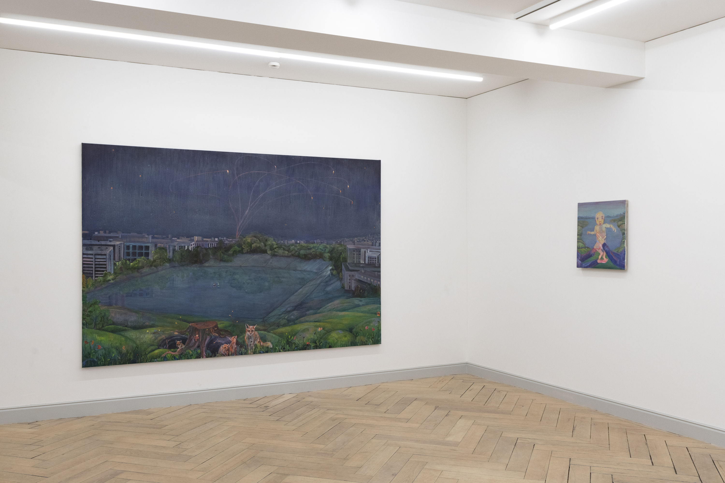 In the next room, the perspective expands to encompass parallel destinies, with which we are constantly confronted, through our ongoing media consumption. In the large-scale oil painting Körper hält Kinderwagen (Body holds baby stroller, 165 x 290 cm), Deplazes unveils a dreamy, surreal, and lush floral landscape. In the foreground, a garden is depicted, with vibrant green grass and a variety of flowers in white, salmon, orange, red, violet, aubergine, and violetblue. Shrubs in rich green tones have been carefully planted and are accentuated by grey stones. Behind, a vast green field stretches out, merging into a mist-covered mountain range. Alone and abandoned, almost dystopian, a figure with a bare torso stands in the garden, barefoot, dressed in royal blue trousers. The figure holds the red frame of a stroller, and is weeping. On the horizon, against the misty sky, a chain of people—families with children in motion—becomes visible. Körper im Kampf (Bodies in combat, 180 x 270 cm) tells of life in war and mechanisms of protection. In the background, interceptor missiles flash. In the midground, two figures are boxing on a meadow; despite the war, they pursue their hobby, playing out a fight. In the foreground, a family of foxes approaches their den. Both the boxers and the foxes exist within an artificial bubble, in safety. In the painting Zwei Körper mit Helm vereint (Two bodies with helmet united, 203 x 167 cm), we see a couple skiing, cheek to cheek, closely embracing eachother.
