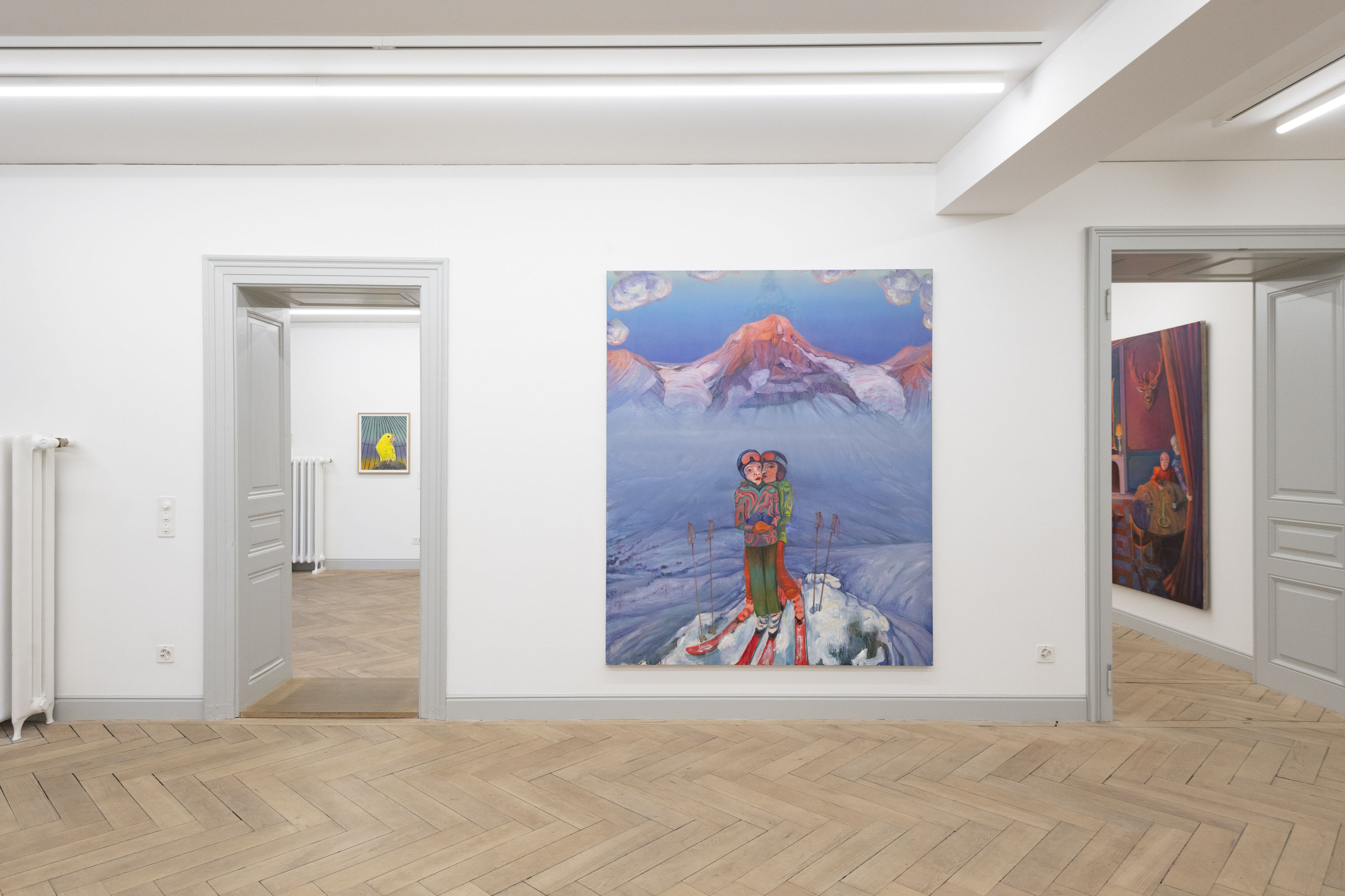 Under the protection of the cloth, the visitors ascend to the upper floor. The first room is dedicated to interior scenes and various family constellations, questioning societal and familial role models. In front of an idyllic mountain panorama, for example, a family of three sits at a table, or a stage scene is presented, leaving it unclear whether the viewers are positioned in front of or behind it. The figures, characteristic of Deplazes' work, are human, yet generic, estranged, and androgynous with vague facial features, portrayed in an isolated manner. Another oil painting depicts two naked bodies in bed, directly gazing into the eyes of the spectator. The duvet, glowing in the light of the setting sun, shimmers in violet and rose hues, evoking a mountainous landscape gently enveloped by drifting clouds.