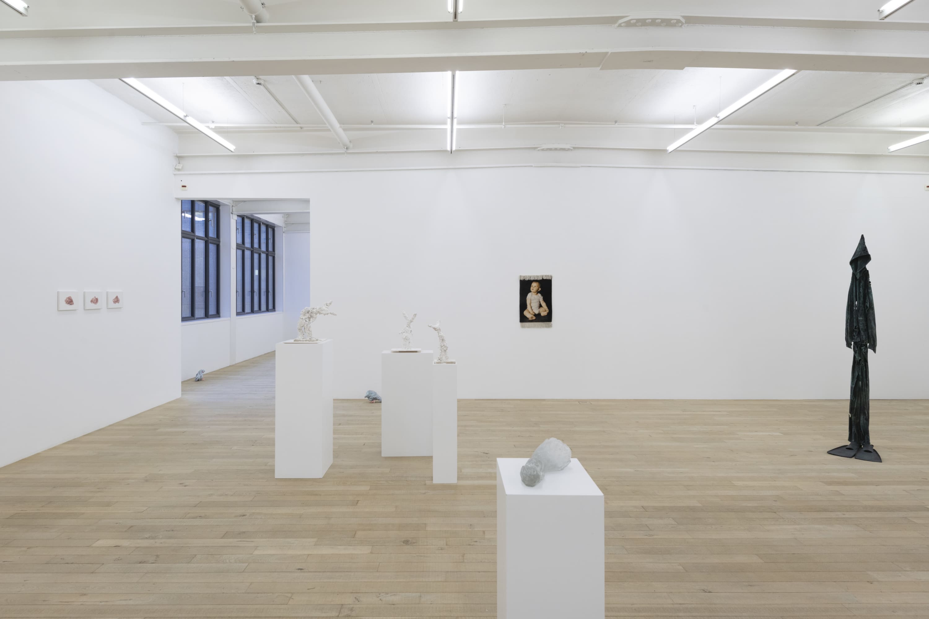 The two sculptures Fuck Me, Please, Thank You, You’re Welcome (2025) and Me in the Studio (Bronze 1, 2025) by Tobias Spichtig (*1982, Sembach, Switzerland; lives and works in Zürich and Berlin) stand in a mystically ghostly manner on the right side of the room. The unusual combination of studio garments and diving fins arose by chance—through an attempt to stabilize the fragile, attenuated sculptures using elements from his atelier. The bronze sculpture, with a greenish patina, was produced by casting an original resin sculpture and then burning it out. This process of burnout imparts a tense verticality and a delicate transparency to the figure. It appears to emerge from the material while simultaneously detaching from it.